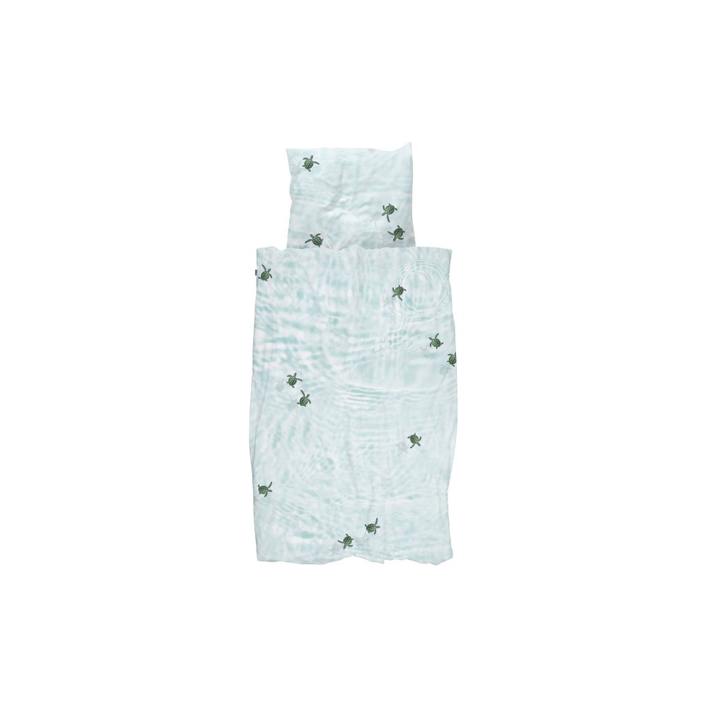 Natur-Feeling-Bettwäsche SEA TURTLES - Wasser-Schildkröten aus 100% hochwertige BIO Baumwolle mit Fotodruck (da kommt Ferienstimmung auf) und Reissverschluss. Double-Face: Vorderseite mit Schildkröten und die Rückseite mit feinem blau/grün-Muster